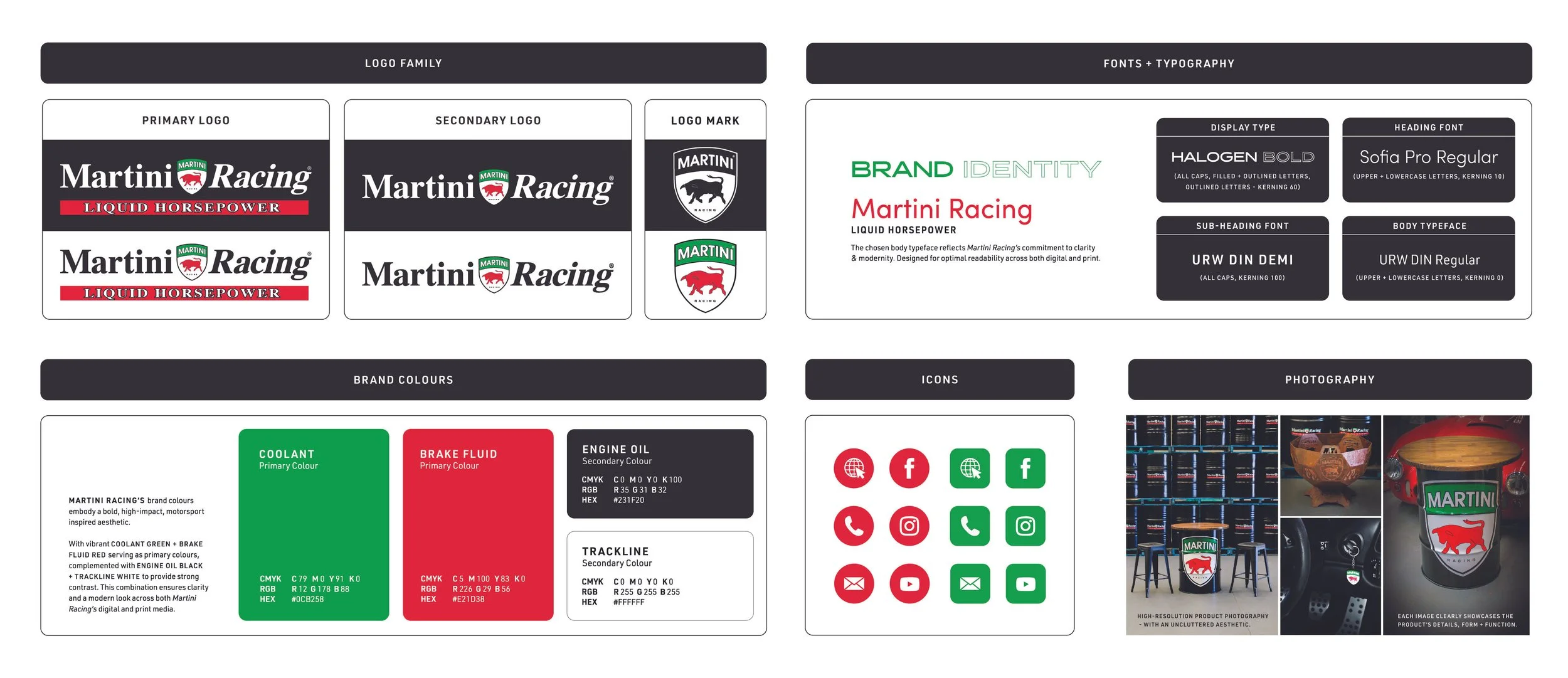 I established a comprehensive brand guide for Martini Racing, defining logo usage along with colour and typography standards to ensure consistency across all branding, packaging, print, and digital touchpoints.